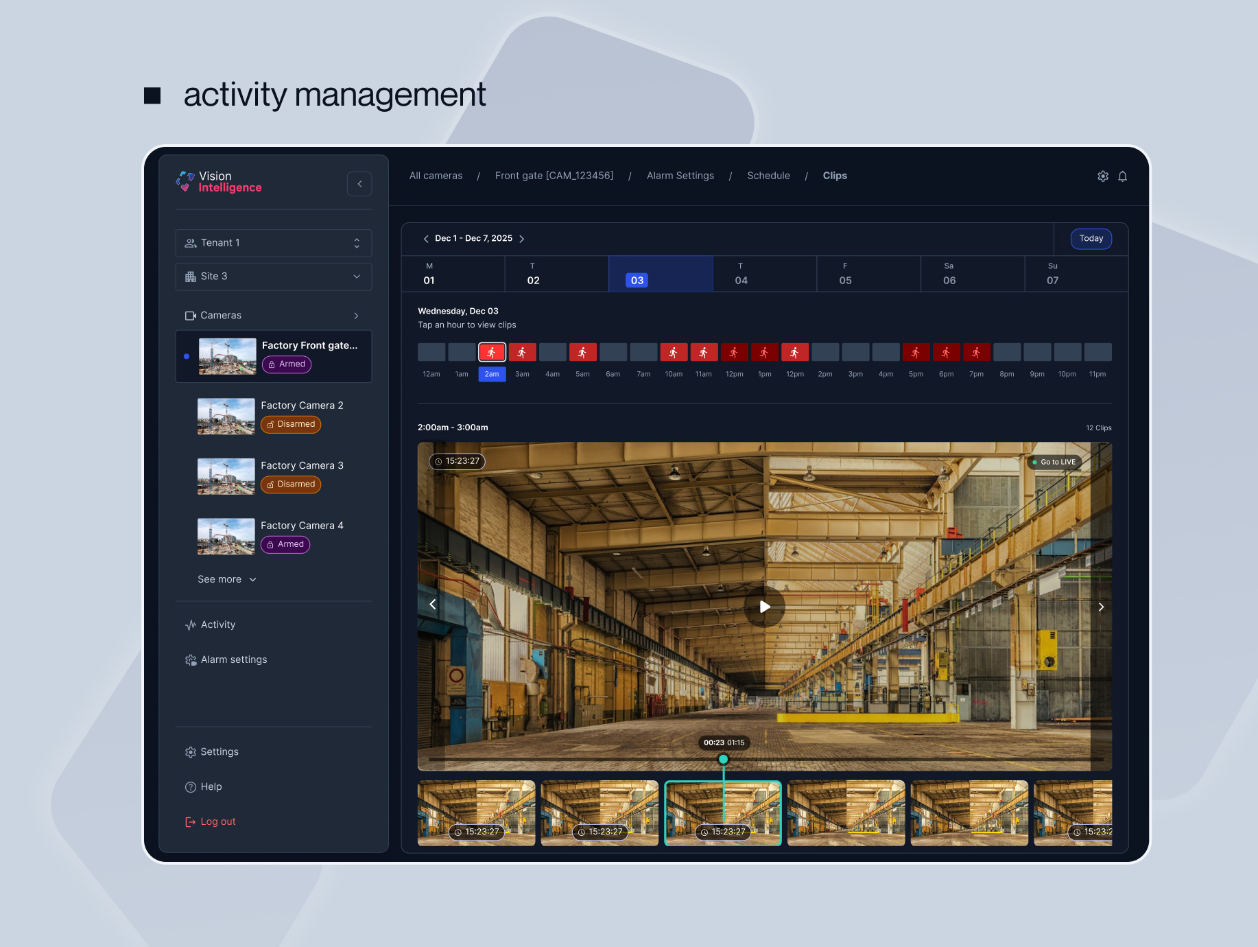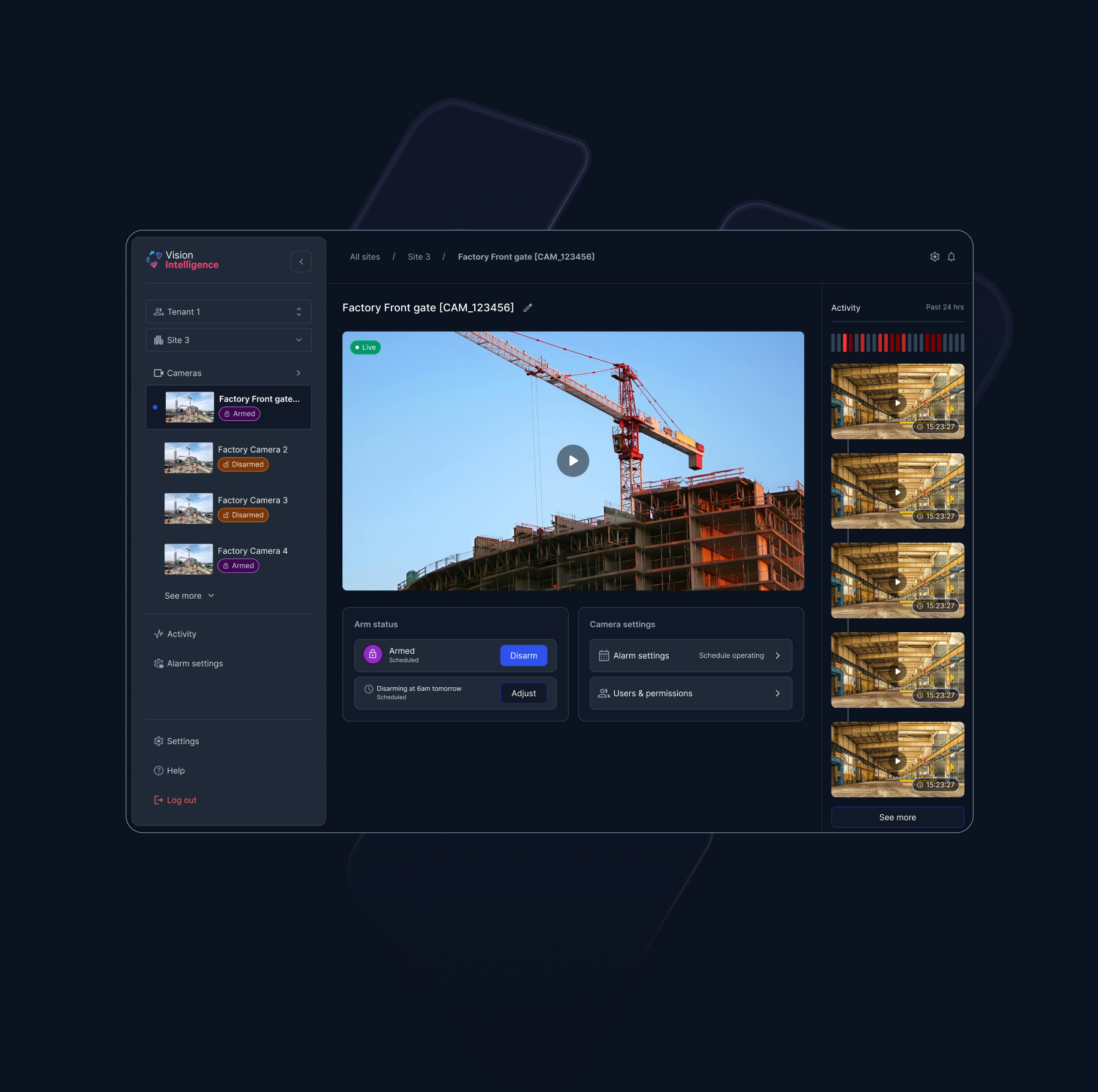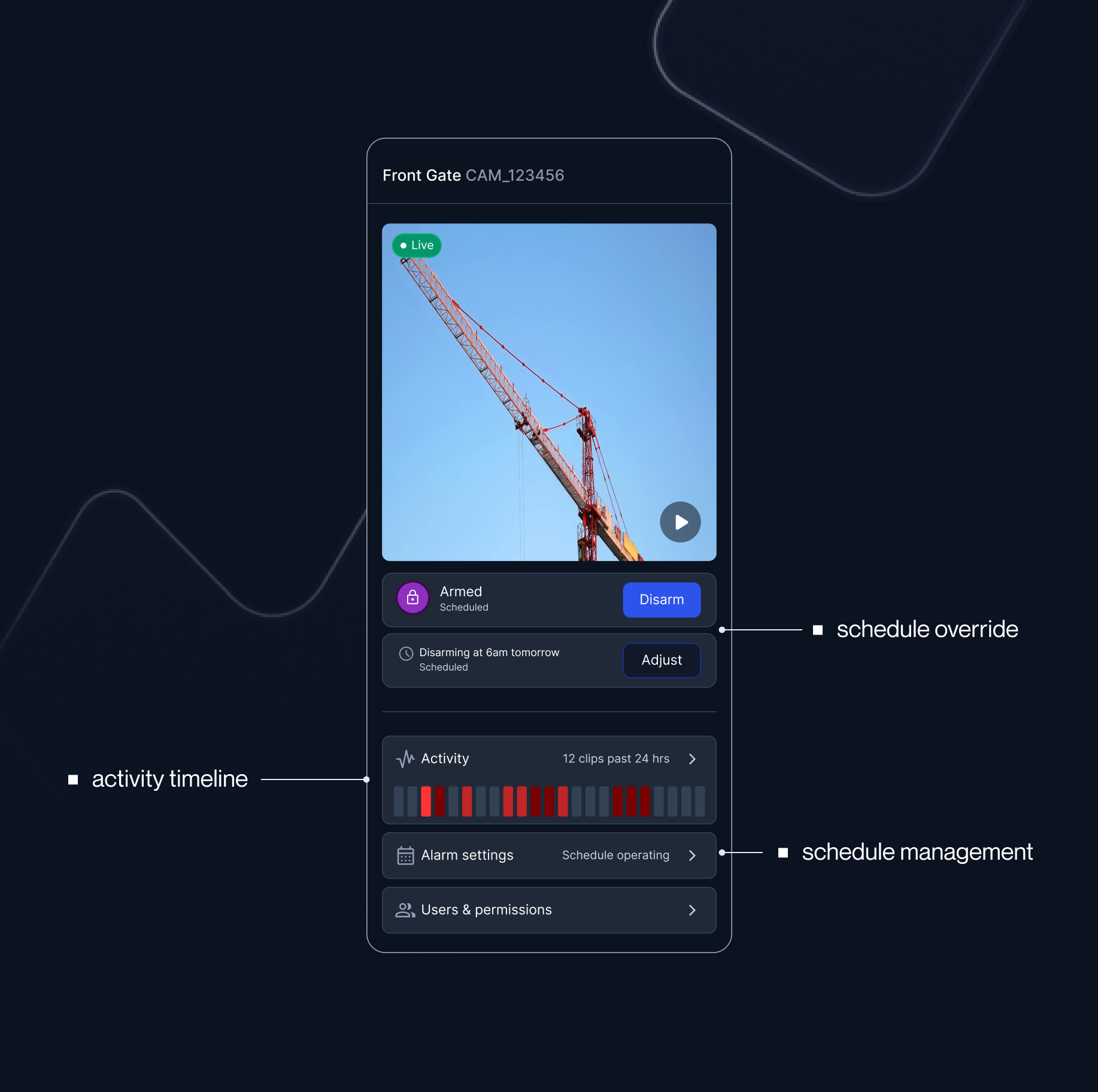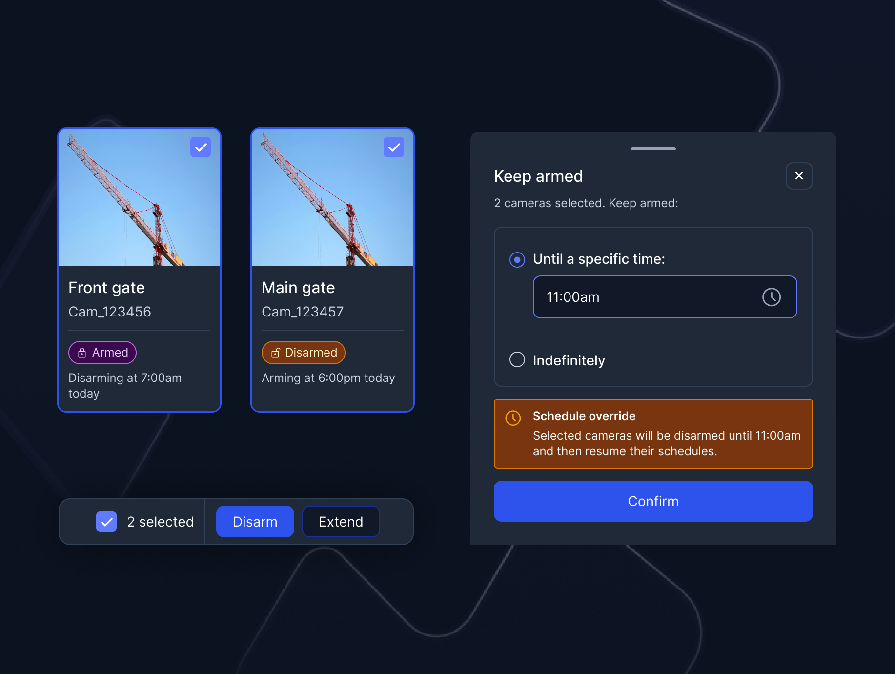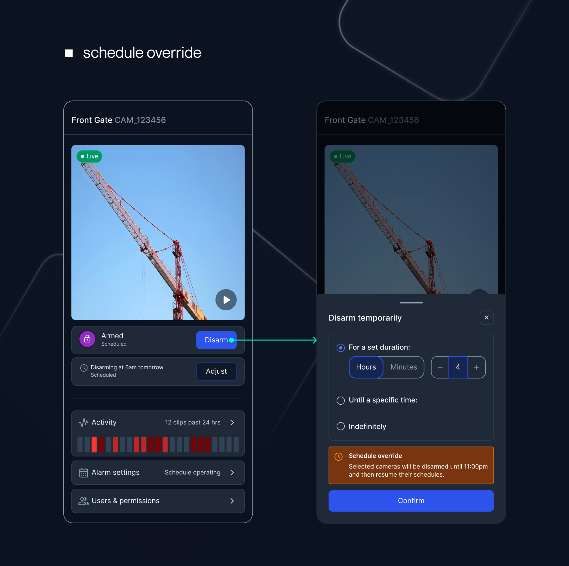 defined a north star centred on clarity, control, and confidence in high-stakes operations. this guided both business impact and a phased delivery approach. phase 1 focused on establishing a foundation through single-camera management of scheduling and alarm settings. phase 2 then built on this UX structure, scaling the experience to support site-wide controls and more complex operational needs.