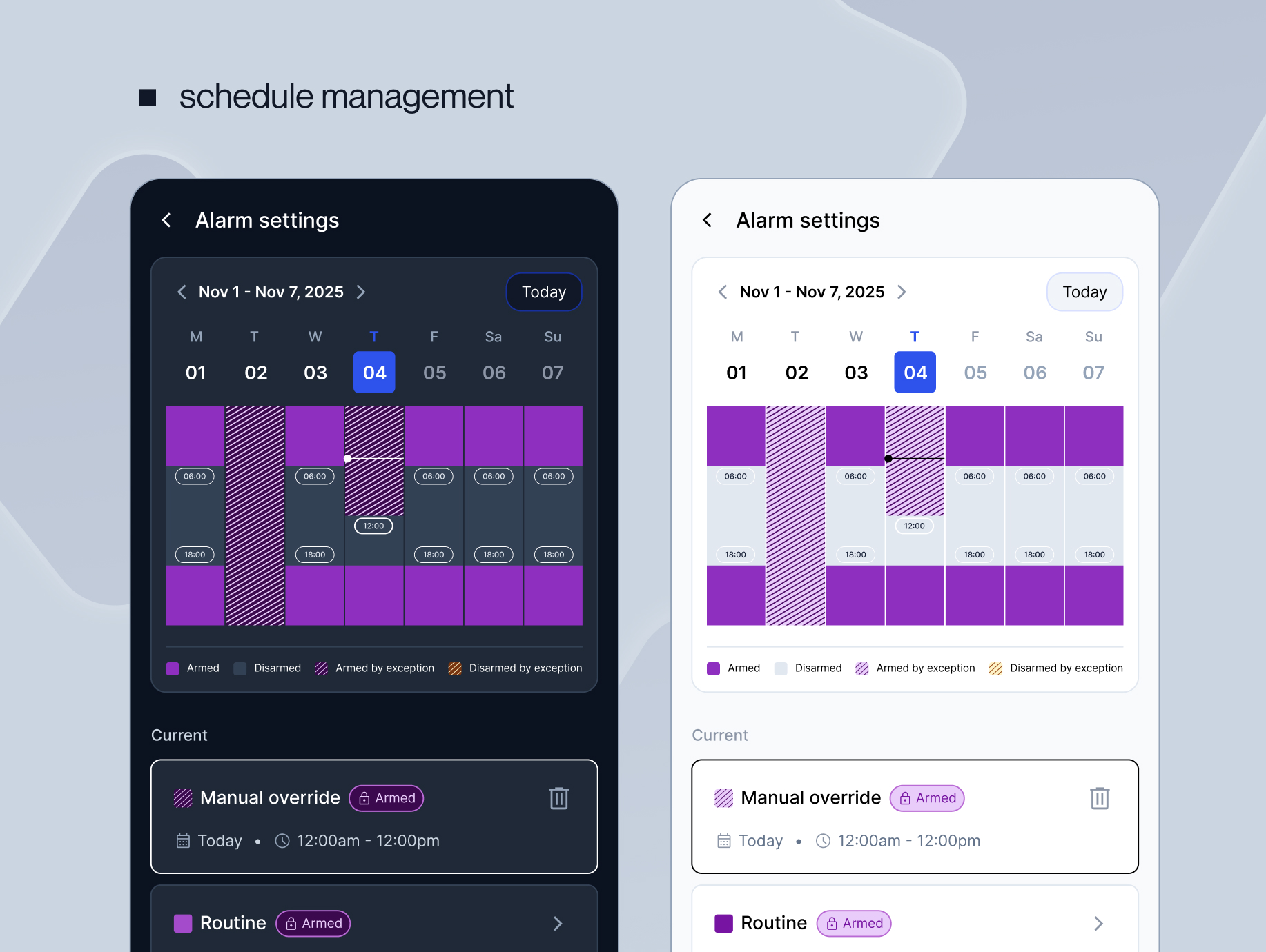the product evolved into a more capable, self-service platform, enabling users to manage complex scheduling, alarm control, and activity tracking with minimal reliance on operations support. at the same time, the interface was modernised into a more polished, professional experience through a new design system and dark mode, bringing it in line with current standards and the updated brand.